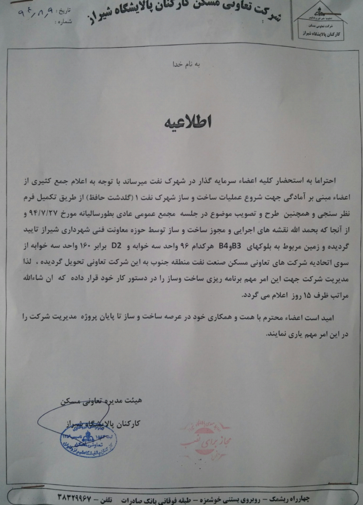 12 آبان آخرین اخبار اطلاعیه 1394/08/12 توسط مدیریت سایت 0 دیدگاه قابل توجه اعضای محترم سرمایه گذار در پروژه شهرک نفت 1 ادامه مطلب