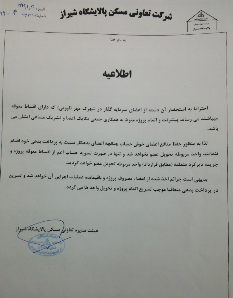 22 فروردین آخرین اخبار بدهی معوق اعضای شهرک مهر 1394/01/22 توسط مدیریت سایت 0 دیدگاه جهت اطلاع اعضای سرمایه گذار در شهرک مهر(لپویی) ادامه مطلب