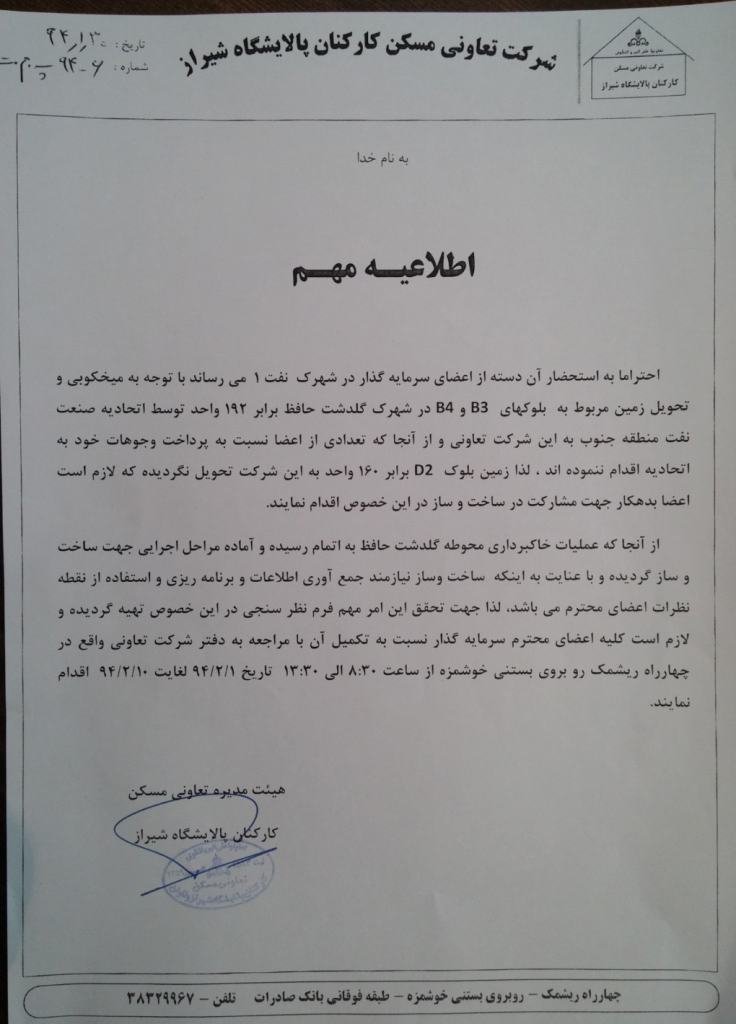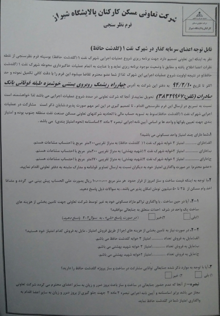 03 اردیبهشت آخرین اخبار اطلاعیه مهم نظرسنجی شهرک نفت 1394/02/03 توسط مدیریت سایت 0 دیدگاه پیرو اطلاعیه ذیل خواهشمند است سرمایه گذاران محترم شهرک نفت 1(گلدشت حافظ) در خصوص تکمیل و تحویل فرم های نظرسنجی اقدام لازم بعمل آورند....ادامه مطلب